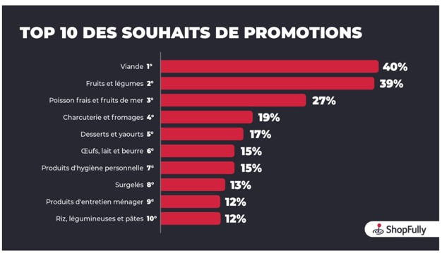 La quasi-totalité des Français (97%) souhaitent davantage de promotions sur les produits alimentaires, avec une forte demande sur la viande fraîche (40%) et les fruits et légumes (39%). Le poisson frais et les fruits de mer (27%) ainsi que la charcuterie (19%) et les desserts et yaourts (17%) figurent également parmi les produits les plus attendus en promotion. Les produits d'hygiène et de beauté intéressent 29% des consommateurs, notamment les jeunes (40%) et les familles avec enfants (41%), tandis que 22% souhaitent des promotions sur les produits d'entretien ménager et pour les animaux.