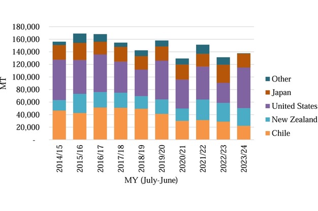 Taïwan importe plus de 135 000 tonnes de pommes par an, l'offre intérieure étant inférieure à 1 %. Post prévoit que les importations taïwanaises de pommes pour l'année fiscale 2024/2025 reviendront à 145 000 tonnes, l'offre intérieure restant stable à 1 250 tonnes. Les États-Unis et la Nouvelle-Zélande sont les principaux fournisseurs, suivis par le Japon et le Chili. Au cours de la campagne 2023/2024, les États-Unis ont gagné 46 % de parts de marché (64 694 tonnes), en grande partie en raison d'une suspension temporaire des exportations sud-africaines causée par le problème de quarantaine de la pyrale de la pomme et parce que les pommes américaines sont toujours compétitives en termes de prix.