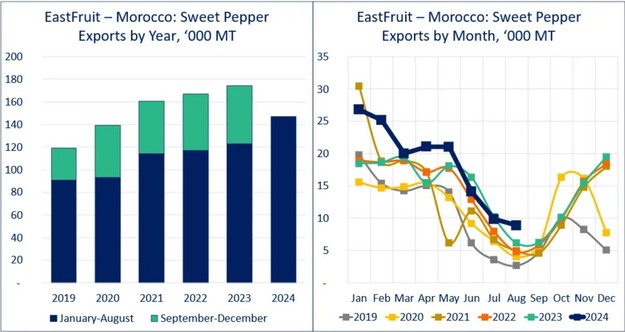 Ce volume représente une augmentation de 20 % par rapport à la même période de l'année dernière, ce qui place le Maroc en bonne position pour établir un nouveau record d'exportation si les taux de croissance actuels se maintiennent. Notamment, les chiffres mensuels d'exportation de poivrons marocains cette année ont, à quelques exceptions près, largement dépassé ceux des années précédentes.