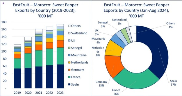 L'Union européenne reste un marché important pour les poivrons marocains, l'Espagne, la France, l'Allemagne et les Pays-Bas étant les principales destinations. Ces pays utilisent les poivrons importés à la fois pour la consommation intérieure et pour la réexportation vers d'autres pays européens.