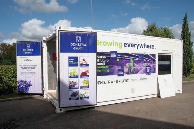 Le « conteneur isotherme » Demetra 2 a été reconditionné pour être utilisé comme ferme verticale. Il a été entièrement personnalisé par Greatit srl, une société spécialisée dans l'agriculture durable. La structure consiste en une chambre d'expérimentation de différents types de plantes, d'un volume interne de 25,13 m3, équipée de tous les instruments nécessaires à la culture de plantes dans des conditions contrôlées. Un système de monitoring de la cellule permet de varier la température, de contrôler l'humidité et d'activer un système anti-stratification qui aspire l'air dans la zone supérieure et le diffuse au sol, de manière à obtenir des conditions thermo-hygrométriques uniformes dans toute la cellule, sans que les flux d'air ne touchent directement la culture. En outre, un système de fertigation permet de distribuer les engrais en utilisant l'eau d'irrigation et d'administrer simultanément différentes solutions.