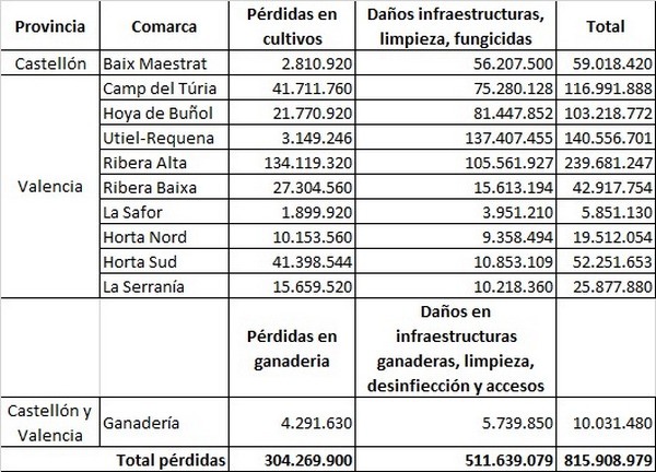 Les dommages sont à la fois structurels et dus à l'impact direct sur les cultures et les exploitations. Dans le premier cas, quelque 172 000 hectares ont pu être touchés de manière plus ou moins importante, et dans le second cas, quelque 50 000 hectares de cultures ont pu être affectés. Les cultures les plus touchées sont les agrumes, les kakis et les légumes, les pépinières et les plantes ornementales et, dans une moindre mesure, les vignobles, où les pertes pourraient s'élever à plus de 300 millions d'euros. D'autres cultures, comme les amandiers, ont déjà été récoltées et d'autres encore, comme les céréales et autres cultures herbacées, n'ont pas encore commencé à être semées. Dans les hectares cultivés, il faudra vérifier l'impact possible sur les plantes et les arbres de l'asphyxie racinaire dans les zones inondées et la capacité de drainage des champs afin de procéder à une évaluation plus exhaustive des dégâts.