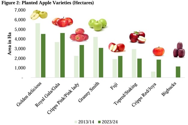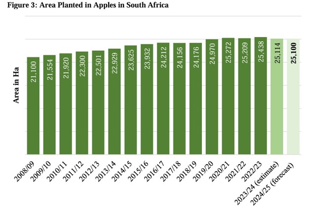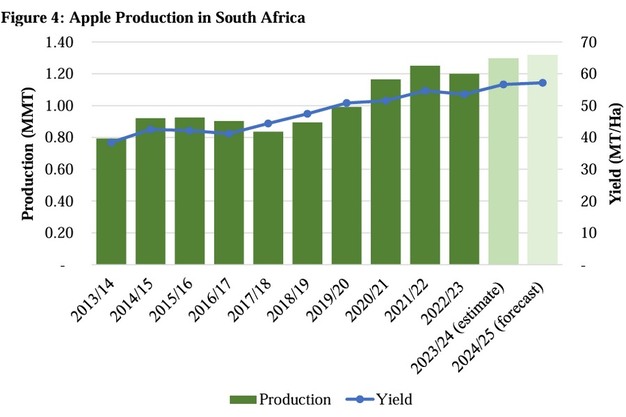 Le rapport annuel sur les fruits à feuilles caduques fournit des informations sur la production, l'offre et la distribution des pommes, des poires et des raisins de table en Afrique du Sud pour les années 2022/23, 2023/24 et 2024/25. La production de pommes devrait s'améliorer de 2 % pour atteindre 1,32 million de tonnes métriques (MMT) au cours du MY 2024/25 par rapport au MY 2023/24, en raison de la disponibilité de l'eau d'irrigation et de l'entrée en pleine production des jeunes arbres. Les exportations de pommes devraient augmenter de 2 % pour atteindre le chiffre record de 710 000 tonnes métriques grâce à l'amélioration de la qualité des fruits.