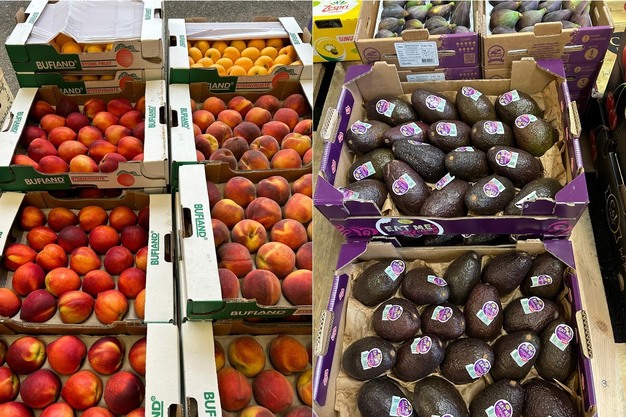 À gauche : fruits à noyau précoces d'origine sud-africaine avec des Nectacot dans le fond / À droite : avocats mûrs du Chili