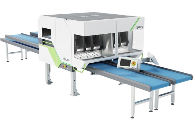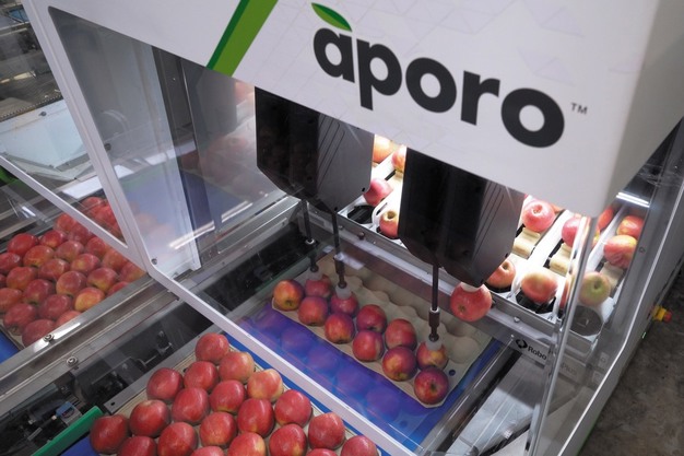 La ligne de remplissage et de bouchage de capsules en carton F115 de Sorma est conçue pour permettre des changements de format rapides grâce à un logiciel qui mémorise différents réglages. Ce système comprend un dépileur, un remplisseur Easypack, un fermeur de capsules et une étiqueteuse. La machine Aporo convient au remplissage de poches, y compris celles qui sont placées à l'avance dans les boîtes. Aporo utilise un bras robotisé à têtes multiples capable de traiter 220 à 300 pommes par minute. Elle est également équipée de caméras vidéo qui détectent les dimensions des poches et positionnent les pommes de manière uniforme, mettant ainsi en valeur leur face la plus colorée.