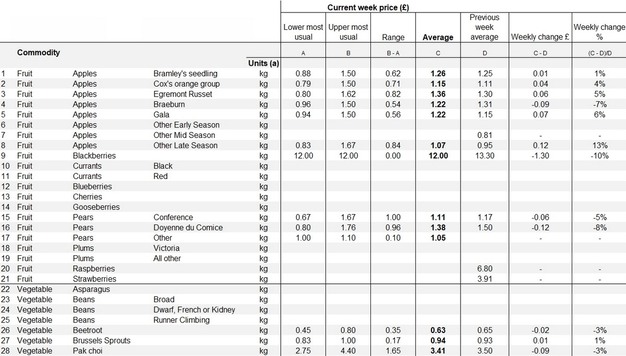 Au cours de la semaine dernière, les prix de gros de divers produits frais ont connu de légères fluctuations. Les pommes, en particulier la Bramley's Seedling, ont vu leur prix augmenter, le prix moyen de la semaine en cours passant de 0,62 £ à 1,26 £ le kilogramme, soit une variation hebdomadaire de 1,25 %. De même, d'autres variétés de pommes comme Egremont Russet et Braeburn ont suivi des tendances à la hausse similaires, reflétant la demande saisonnière.