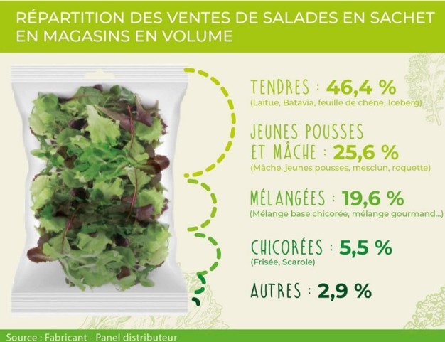 La laitue numéro 1 des ventes en volumes. La majorité des salades vendues en sachets en magasins sont des salades « tendres », c'est-à-dire de type laitue : aujourd'hui, elles représentent 46,4 % des volumes vendus en magasins. Source : Fabricant – panel distributeurs 2024