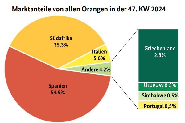 La présence d'oranges espagnoles a nettement augmenté, bien qu'elle soit restée inférieure à celle de l'année précédente. Les Navelina, proposées dans divers calibres, ont été les plus prisées. À Francfort, des Newhall portugaises ont également été proposées à 2,20 €/kg. On trouvait également des oranges non traitées en provenance d'Italie, qui, malgré des prix variant entre 1,80 et 2,40 €/kg, ont suscité un intérêt suffisant. Les arrivages grecs étaient exclusivement destinés à Berlin, où ils ont été commercialisés sous forme de jus. Selon le BLE, l'offre européenne a globalement gagné en importance.