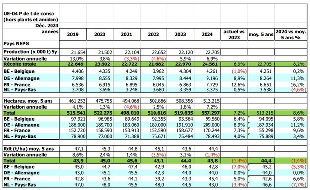 différents, allant de moins de 20 t/ha à plus de 70 t/ha. Cela a dépendu principalement des dates de plantation. La superficie totale de l'UE-04 a augmenté de 37.700 ha (+ 7,2 %) et la production totale a augmenté de 6,9 % pour atteindre 24,6 millions de tonnes (+ 1,6 million de tonnes). Dans le même temps, les besoins de l'industrie de la transformation sont également plus élevés