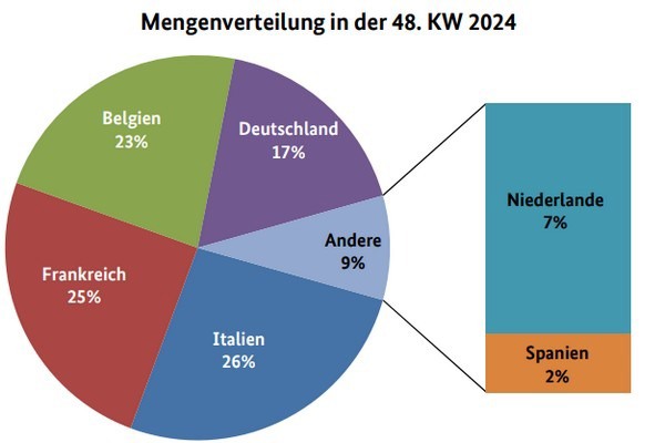 Les offres italiennes ont dominé le marché, épaulées par les produits français et belges. Leur présence s'est renforcée de manière synchronisée. Par ailleurs, l'importance des lots complémentaires néerlandais et espagnols a augmenté. En revanche, la fin de saison a marqué une diminution notable des produits nationaux, dont la qualité, contrairement à celle des concurrents, n'était pas toujours satisfaisante. Globalement, selon le BLE, l'assortiment était varié, mais sans excès. La demande, bien que modérée, a pu être satisfaite sans difficulté. Les prix ont évolué de manière inégale : à Berlin, ils ont globalement baissé, tandis qu'à Francfort et Cologne, les cotations ont grimpé, notamment pour les lots belges et parfois français. À Hambourg et Munich, les fluctuations habituelles des prix ont été observées.