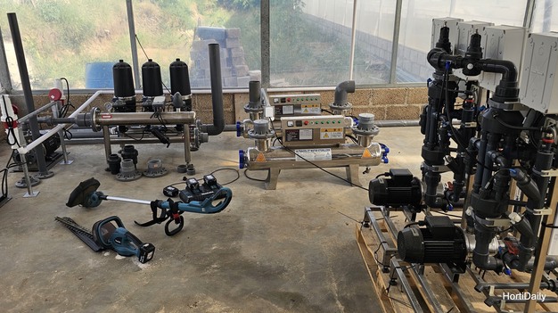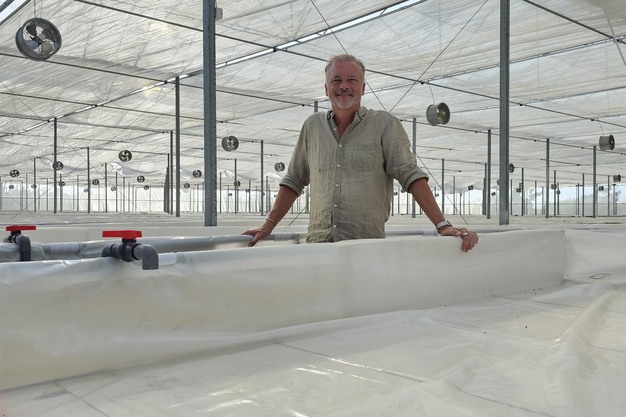 Le défi réside dans la culture elle-même, mais pour cela, l'entrepreneur s'appuie sur un technicien expérimenté et un système de culture partiellement automatisé. L'eau de mer dessalée par osmose inverse, fournie par la société Aqualectra, est refroidie à 22-24 degrés, filtrée et traitée aux rayons UV avant d'être utilisée sur les tables avec des nutriments. Il y a un trop-plein au bout des tables, après quoi l'eau est pompée vers un réservoir tampon et filtrée pour être réutilisée. Le système mesure automatiquement la nutrition, le pH et la température de l'eau, après quoi il peut également procéder à ses propres ajustements. « Les calculs montrent que les plus de 100.000 salades réparties sur les 130 tables absorbent entre 8 et 10 m3 d'eau par jour. Le taux d'évaporation est plutôt négligeable grâce aux plaques de PVC expansé. Ce système circulaire entièrement fermé est une solution existante et éprouvée à Bahreïn et bien connue de notre chef de production. »