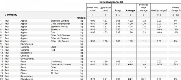 Les pommes Bramley ont affiché un prix moyen de £1,32 contre £1,32 la semaine précédente, conservant ainsi le même prix. Les pommes Cox Orange ont également vu leur prix se stabiliser de £1,20 à £1,20. Ces prix inchangés suggèrent un marché stable avec des conditions d'approvisionnement constantes.