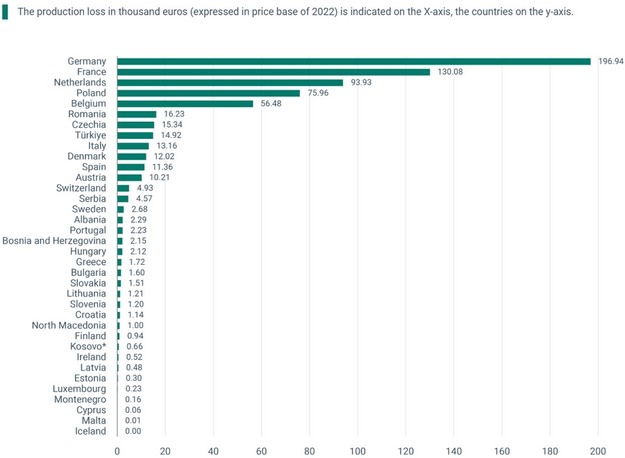 La Belgique et la Roumanie, avec des pertes respectives de 56,48 millions d'euros et de 16,23 millions d'euros, présentent un écart notable par rapport aux pays les plus performants, tout en mettant en évidence d'importantes perturbations économiques. Des pays comme la République tchèque (15,34 millions d'euros), la Turquie (14,92 millions d'euros) et l'Italie (13,16 millions d'euros) ont également subi des impacts notables, mais dans une moindre mesure que leurs homologues d'Europe occidentale. Ces chiffres soulignent à quel point les différentes conditions économiques et structurelles dans l'UE et les régions voisines déterminent l'ampleur des pertes subies par chaque pays.