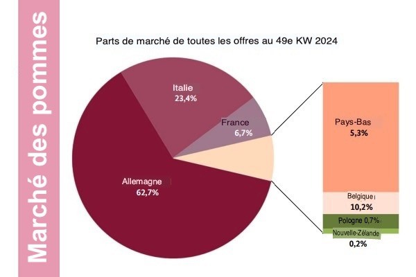 Les offres nationales, notamment Elstar, Royal Gala, Jonagold, Boskoop et Braeburn, ont constitué comme d'habitude la base de la palette de marchandises à cette période de l'année. Les arrivages italiens, en particulier Golden Delicious et Granny Smith, suivaient en importance. Selon BLE, les Red Delicious ont été particulièrement appréciées pendant la semaine de la Saint-Nicolas en raison de leur couleur vive et ont pu être écoulées rapidement. Comme les semaines précédentes, la France a participé en priorité avec des Jazz et des Pink Lady, qui ont généralement été transbordées rapidement. Wellant et Elstar provenaient des Pays-Bas, Boskoop de Belgique. Les déchargements de Pologne n'ont joué qu'un rôle ponctuel et mineur. Les importations d'outre-mer ont presque totalement disparu de l'assortiment.