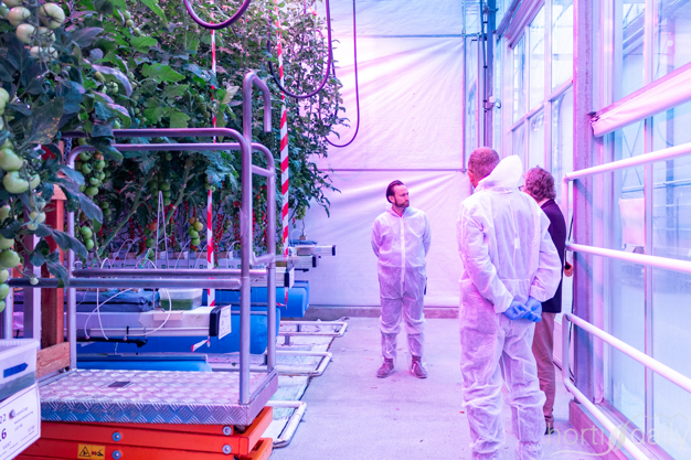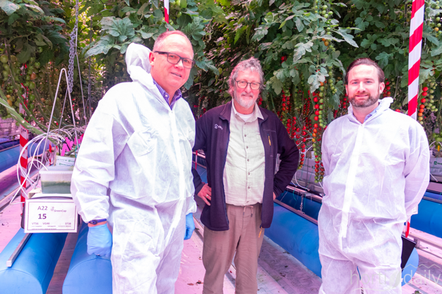 Jarle Skjæveland, Michel Verheul et Andreas Grunbaum dans les installations de recherche du NIBIO.