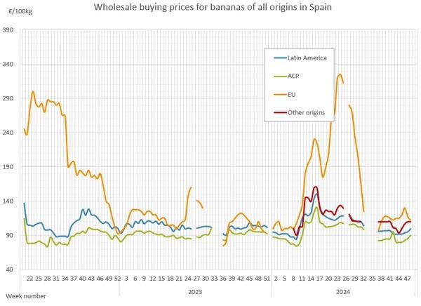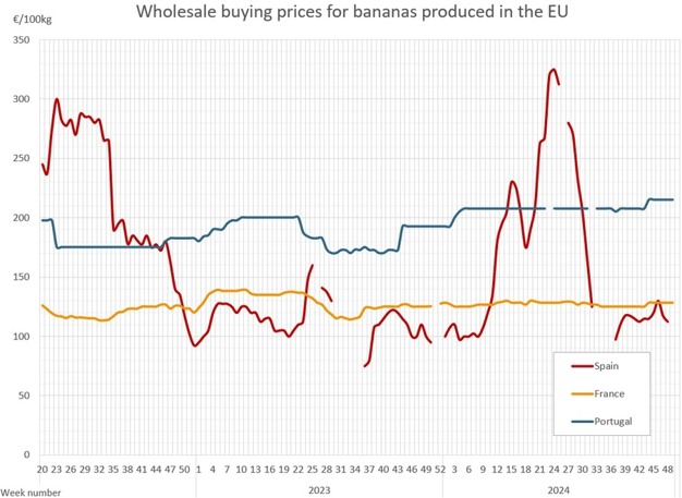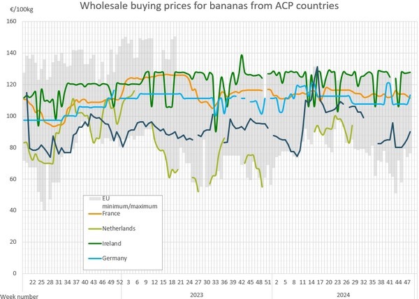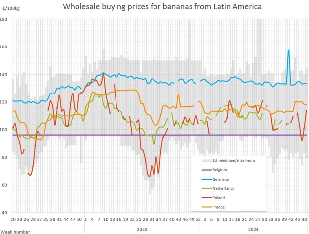 La Pologne (PL) affiche une tendance contrastée, les prix passant de 101 € au cours de la semaine 48 à 113 € au cours de la semaine 49. Cette augmentation significative suggère une hausse de la demande ou des contraintes d'approvisionnement, éventuellement dues à des habitudes d'achat saisonnières ou à des problèmes logistiques. La hausse des prix en Pologne met en évidence la variabilité des marchés de la banane en Europe, où la dynamique de l'offre et de la demande diffère en fonction des habitudes de consommation régionales et des capacités d'infrastructure. Ces changements illustrent collectivement les tendances nuancées des prix sur le marché européen de la banane au cours des premières semaines de décembre 2024.