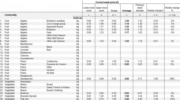 Les données comparent le prix "moyen" de la semaine en cours et le prix "moyen de la semaine précédente" pour plusieurs fruits, révélant des fluctuations mineures et significatives pour certaines variétés. Parmi les pommes, par exemple, les pommes de semis de Bramley ont connu une légère baisse, la moyenne de la semaine en cours étant de 1,29 £ contre 1,32 £ la semaine précédente, soit une baisse de 0,03 £, ce qui équivaut à une diminution de 2 %. Une tendance similaire peut être observée pour les pommes du groupe orange de Cox, dont le prix est passé de 1,20 £ la semaine dernière à 1,19 £ cette semaine, soit une baisse mineure de 0,01 £ ou 1%. Ces changements suggèrent des modifications subtiles des conditions de l'offre ou de la demande pour ces variétés de pommes.