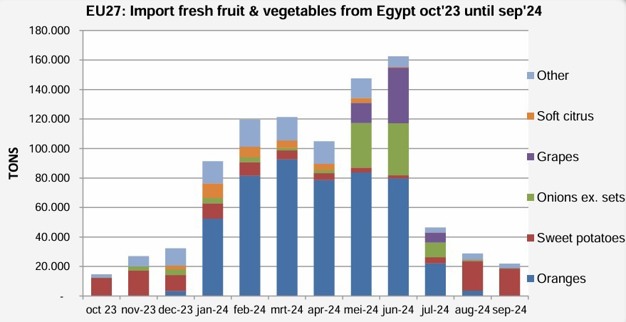 Les oranges égyptiennes sont disponibles d'octobre à juillet, mais les importations de l'UE se font principalement de janvier à juin. Durant cette période, elles dominent les importations néerlandaises d'oranges. De juillet à novembre, elles sont principalement importées d'Afrique du Sud.