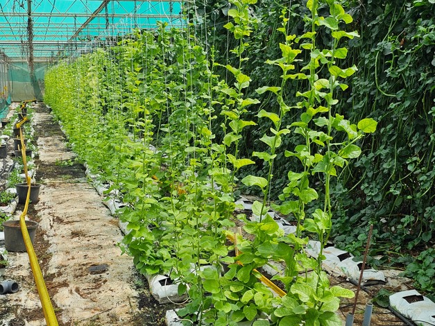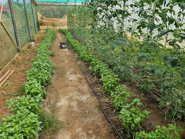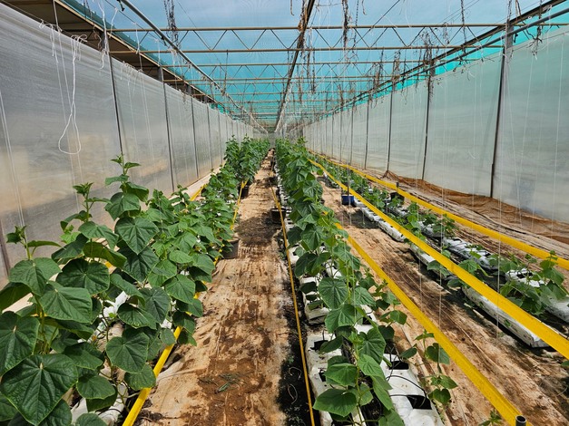 La température élevée constante d'environ 33 °C est le plus grand défi de la culture. « L'eau d'irrigation se réchauffe considérablement pendant la journée, c'est pourquoi nous préférons arroser les plantes tôt le matin et tard le soir. Nous irriguons parfois aussi pendant la journée, mais il faut alors en permanence tenir compte de la température de l'eau. Au milieu de la journée, les feuilles de concombre deviennent complètement molles, puis elles se rétablissent le soir. Nous ne refroidissons pas l'eau et nous n'avons pas de ventilateurs suspendus dans la serre, à cause du coût d'électricité. Seul le vent qui souffle dans la serre assure le refroidissement. »