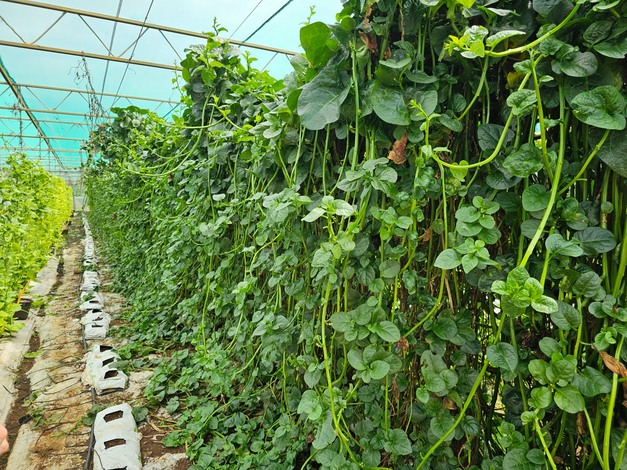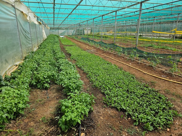 Dans la serre ouverte de 4 500 m2, où les plantes ne sont protégées du soleil que par un simple écran, la pression des ravageurs est forte mais tout juste gérable. « Nous souffrons surtout de la mouche blanche et des tétranyque. Avec les températures toujours chaudes, ils trouvent ici des conditions de vie idéales. Leur cycle de croissance est assez court. Nous utilisons des rubans collants pour attraper la mouche blanche, qui s'attaque principalement aux cultures de concombres. Les grenouilles de la serre aiment les mouches blanches. Et si la situation devient vraiment incontrôlable, nous nettoyons tout, ou une partie de la serre, car elle est divisée en plusieurs compartiments. »