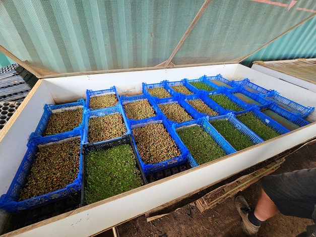 La température élevée constante d'environ 33 °C est le plus grand défi de la culture. « L'eau d'irrigation se réchauffe considérablement pendant la journée, c'est pourquoi nous préférons arroser les plantes tôt le matin et tard le soir. Nous irriguons parfois aussi pendant la journée, mais il faut alors en permanence tenir compte de la température de l'eau. Au milieu de la journée, les feuilles de concombre deviennent complètement molles, puis elles se rétablissent le soir. Nous ne refroidissons pas l'eau et nous n'avons pas de ventilateurs suspendus dans la serre, à cause du coût d'électricité. Seul le vent qui souffle dans la serre assure le refroidissement. »