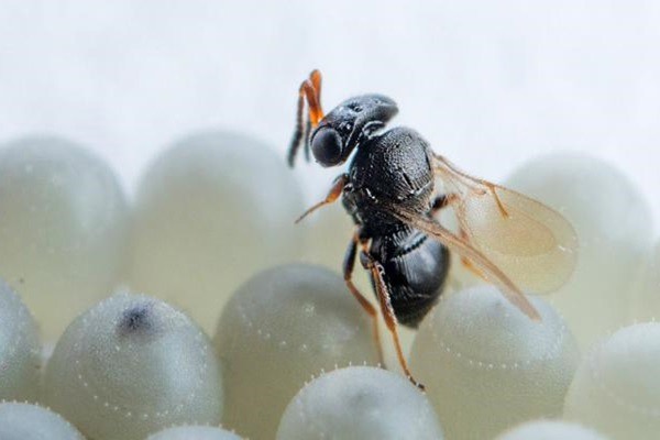 La guêpe samouraï parasite les œufs de H. halys en y déposant ses propres œufs à l'intérieur. Au fur et à mesure que les larves de guêpes se développent, elles tuent les œufs de la punaise. Une seule guêpe adulte émerge alors de chaque œuf de punaise.