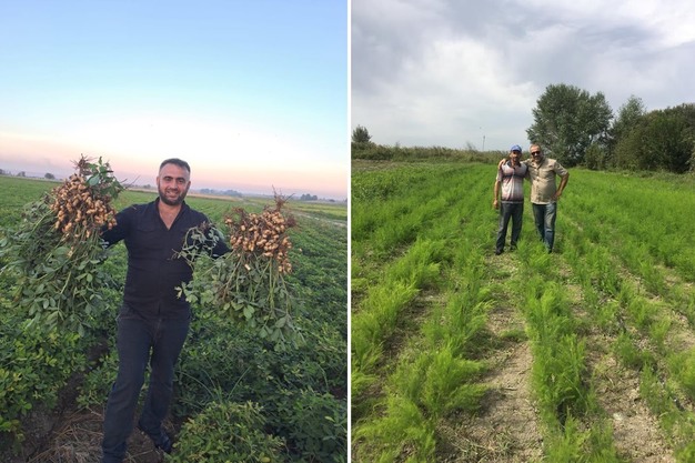 À gauche : Cengiz Hashimov, producteur local partenaire, sur la plantation de cacahuètes Wasserstein Lopafa à Aghstafa. À droite : Ayaz Bayramov en compagnie de Mukhtar, producteur local partenaire, à la ferme d'asperges Wasserstein Lopafa