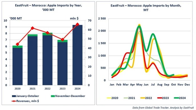 L'importation des variétés de pommes au Maroc a connu une tendance haussière constante, atteignant un nouveau zénith au cours des dix premiers mois de l'année 2024 avec un volume d'importation total de 9,3 mille tonnes, d'une valeur de plus de 65 millions de dollars, selon EastFruit. Ce chiffre représente un record depuis 2011 et illustre une augmentation de près de 50% par rapport à 2020. Malgré un léger fléchissement en 2023, la trajectoire générale au cours des cinq dernières années souligne un appétit croissant pour les pommes importées au Maroc.