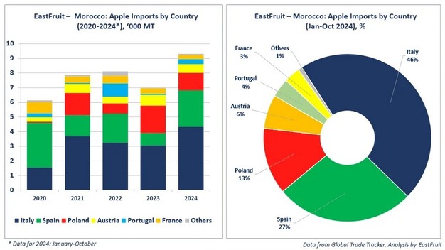 Les pays européens dominent le marché des exportations de pommes vers le Maroc, l'Italie étant en tête avec 46 % des importations totales de janvier à octobre 2024, suivie de l'Espagne et de la Pologne. La période a également été marquée par une augmentation des exportations de pommes de l'Italie et de l'Espagne vers le Maroc, contrastant avec une baisse des importations de la Pologne et du Portugal. Au total, des pommes ont été exportées vers le Maroc depuis 13 pays différents en 2024.