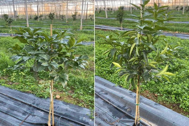 C'est auprès des Pépinières Vessières dans le département des Pyrénées-Orientales qu'Anthony Oboussier s'est procuré les plants d'agrumes et d'avocat. Grâce à un partenariat entre le pépiniériste et la Chambre d'Agriculture, Anthony a pu bénéficier d'une journée formation sur place. Sur la photo à gauche le Pomelo et à droite la Clémentine.