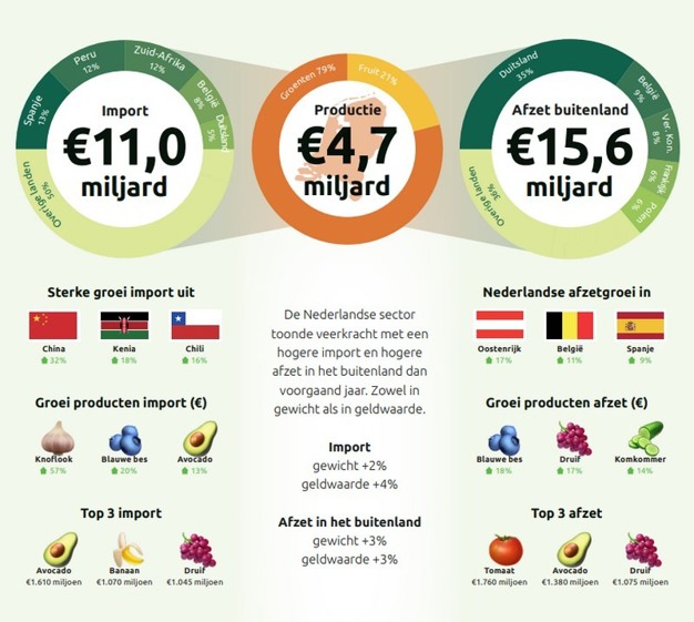 La production néerlandaise de fruits et légumes représentait une valeur de 4,7 milliards d'€ en 2024. En outre, les importations ont augmenté de 4 % pour atteindre 11,0 milliards d'€, et les exportations ont augmenté de 3 % par rapport à 2023, avec une valeur totale des exportations de 15,6 milliards d'€.