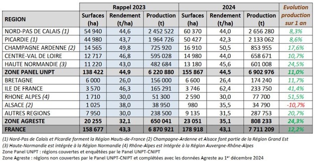 « La campagne de production 2024 marque une étape importante pour la filière pomme de terre française. Avec une augmentation significative des surfaces dédiées à la conservation (+ 11 %), atteignant 178 900 hectares selon les derniers chiffres d'Agreste, les premiers bilans révèlent une production qui poursuit sa croissance malgré les défis climatiques d'une saison particulièrement humide et éprouvante pour les producteurs. Après une année 2022 caractérisée par des rendements catastrophiques et un rebond notable en 2023, la récolte 2024 s'inscrit dans la moyenne décennale, atteignant un rendement brut national de 43,1 t/ha, et de 44,5 t/ha dans les zones du panel UNPT/CNIPT (Picardie, Nord Pas-de-Calais, Champagne-Ardenne, Centre, Haute-Normandie). »
