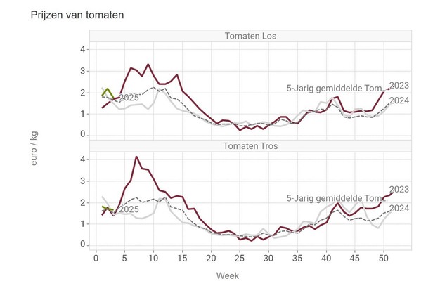 Depuis début décembre, les prix des tomates étaient sortis d'un creux (jusqu'à 2,20 €/kg), mais la semaine dernière, les prix médians de la VBT ont de nouveau chuté (1,77 €/kg pour les tomates rondes et 1,67 €/kg pour les grappe), s'établissant juste au-dessus de la moyenne quinquennale.