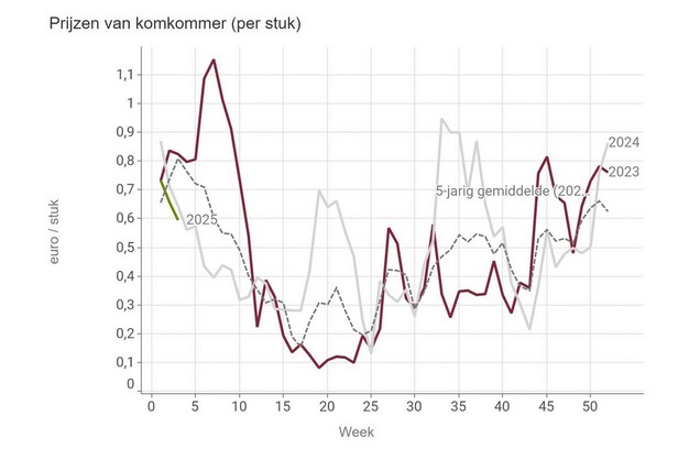 Il n'en va pas de même pour le concombre dont le prix moyen est en baisse depuis le début de la nouvelle année. Il atteint en moyenne 59,4 centimes d'€ au cours de la semaine 3.