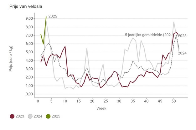 La laitue est tombée à environ 0,53 €/pièce en ce début d'année. Les salades se situent autour de 0,70 €/kg en moyenne, des prix normaux pour cette période de l'année, note Boerenbond dans une récente analyse de la situation du marché. Le prix de la mâche a atteint un sommet, avec une moyenne de 9,26 €/kg, comparée aux 6 €/kg habituels reálisés en semaine 3.