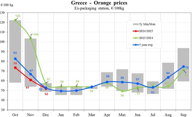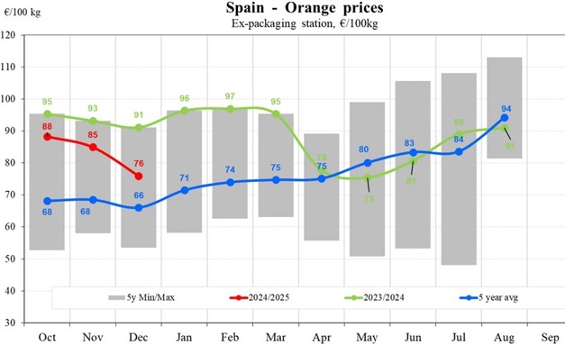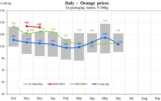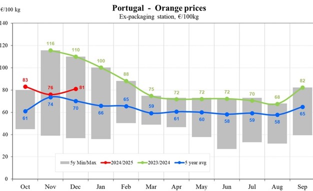 Enfin, au Portugal, les prix des oranges pour la saison 2024/2025 ont commencé à 83 €/100. Bien que les prix aient baissé à 76 €/100 kg en novembre et soient remontés à 81 €/100 kg en décembre, ils sont restés constamment inférieurs aux valeurs de la campagne 2023/2024.