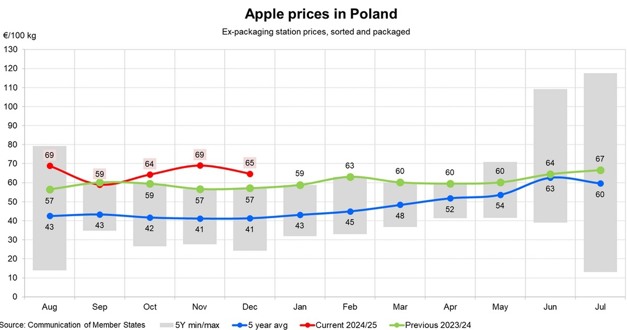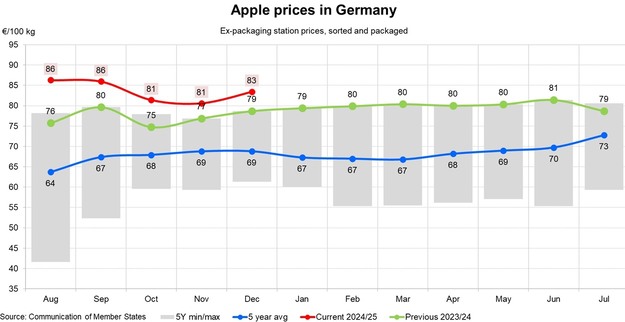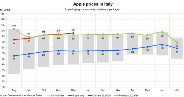 En Italie, les prix des pommes ont suivi une tendance similaire à celle de l'année dernière, mais sont restés légèrement inférieurs pendant la plupart des mois. En août, les prix étaient de 92 €/100 kg cette année, en dessous des 101 €/100 kg enregistrés la saison dernière. L'écart s'est comblé en octobre, avec des prix de 996 €/100 kg cette année, contre 96 €/100 kg l'année dernière également. En décembre, les prix se sont rapprochés à 98 €/100 kg pour la saison en cours et à 96 €/100 kg pour la saison précédente.