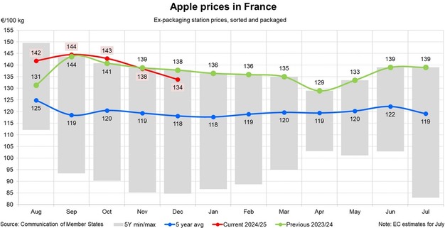 En France, les prix des pommes ont été nettement plus élevés cette année par rapport à la campagne 2023/24. Les prix d'août ont atteint 142 €/100 kg, contre 131 €/100 kg l'année dernière, et ont conservé une avance significative en septembre et octobre, où les prix ont atteint 144 €/100 kg, contre 144 €/100 kg en septembre, et 143 €/100 kg, contre 141 €/100 kg en octobre. Toutefois, l'écart s'est réduit en novembre et décembre, les prix actuels s'établissant à 134 €/100 kg, soit à peine moins que les 138 €/100 kg de l'année dernière.