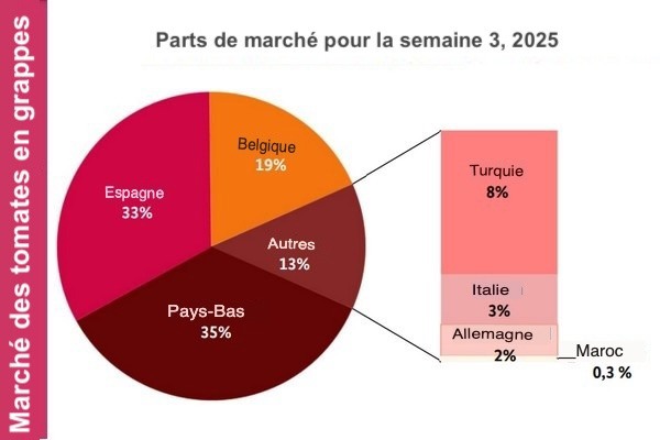 Dans l'ensemble, les clients ont bénéficié d'un large éventail de variétés de tomates. Les tomates en grappes provenaient principalement des Pays-Bas et d'Espagne, suivies de près par les offres belges. Les tomates cerises étaient majoritairement expédiées depuis l'Espagne et l'Italie. Concernant les tomates rondes, les importations marocaines et turques ont dominé, selon le BLE. Dans le segment des tomates charnues, ce sont les lots marocains et espagnols qui ont pris la tête du marché. Globalement, les clients ont pu profiter d'un assortiment particulièrement diversifié, avec une qualité généralement irréprochable. La demande, parfois dynamique, a néanmoins été comblée sans difficulté. Les prix ont peu évolué : bien que des hausses aient été observées en début de semaine, elles se sont estompées à mesure que les commerçants ont réduit leurs tarifs pour éviter une accumulation d'invendus.