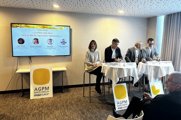 S'en est suivi une table-ronde consacrée au thème « La filière maïs doux face au défi de l'agriculture régénératrice » pour préparer l'avenir et s'inscrire dans la transition écologique en parcourant les pratiques vertueuses de l'agriculture régénératrice et les opportunités économiques qu'elles offrent pour les exploitations. Parmi les pratiques vertueuses mises en place : couverts hivernaux, l'utilisation de composts, le déploiement d'outils d'agriculture de précisions pour limiter l'usage des phyto, des OAD de pilotage de l'irrigation etc. Et si les nouvelles pratiques ne permettront pas d'augmenter les prix de ventes,
