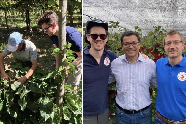 Jan Henrik zum Felde et Stephan Kratzer en visite sur la plantation du partenaire producteur Cesar Gomez (au milieu) au Chili.