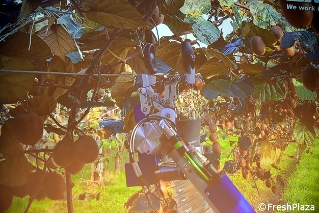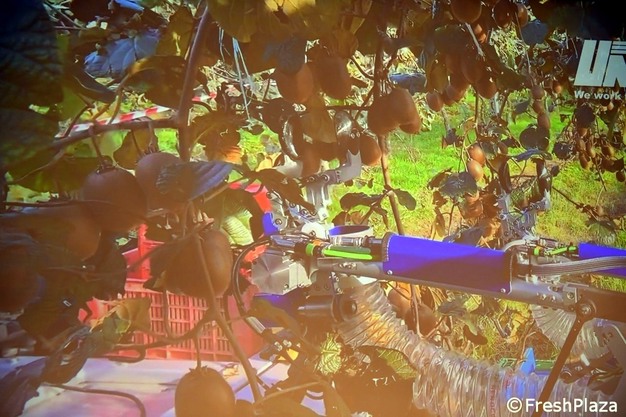 Test de récolte robotisée sur kiwi (photo extraite de la vidéo projetée par Unitec lors de la conférence)