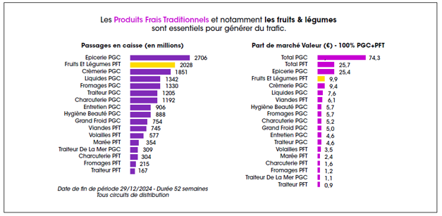 • Certaines enseignes tel que Grand Frais qui tire son épingle du jeu : 21,7% de ménages font leurs achats de PFT dans cette enseigne (CAM P11 2024), soit +344 000 clients supplémentaires vs 2023, à raison de 10,3 fois par an, et pour une taille de panier de 25€ à chaque visite.