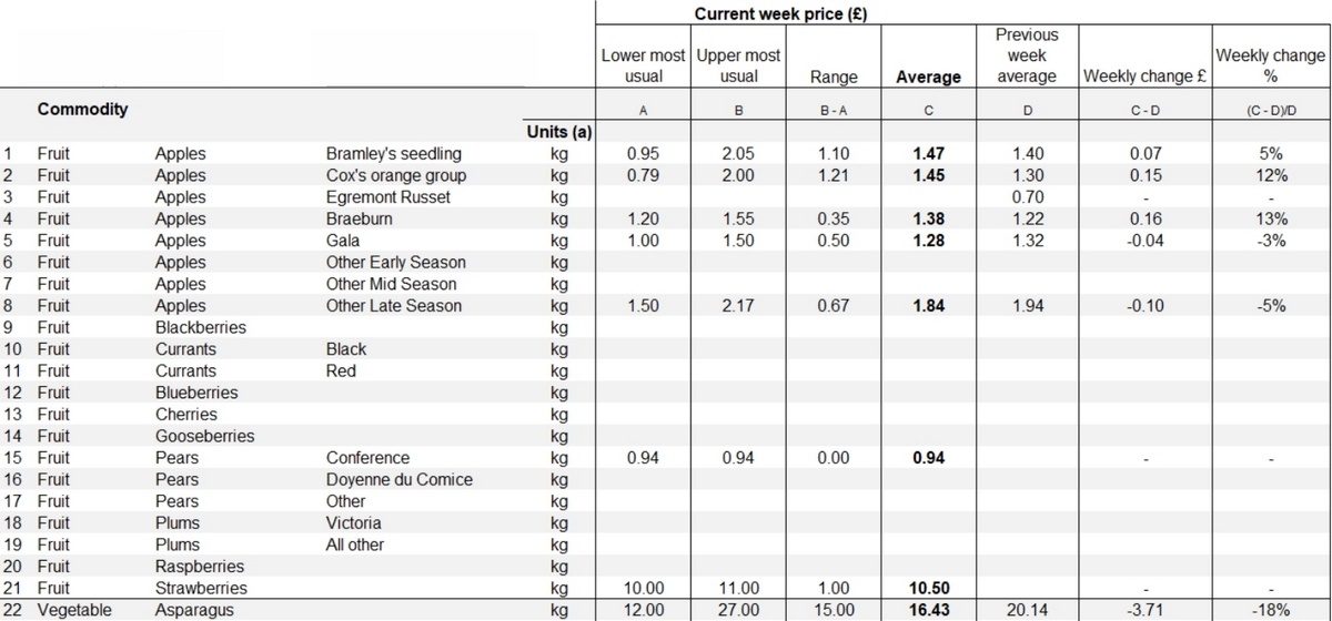 Les asperges ont enregistré la baisse de prix la plus importante parmi les produits listés. Le prix moyen est passé de £20,14 à £16,43 par kilogramme, soit une réduction de £3,71 ou 18% par rapport à la semaine précédente. Cette forte diminution représente la plus forte baisse hebdomadaire en pourcentage parmi tous les produits répertoriés.