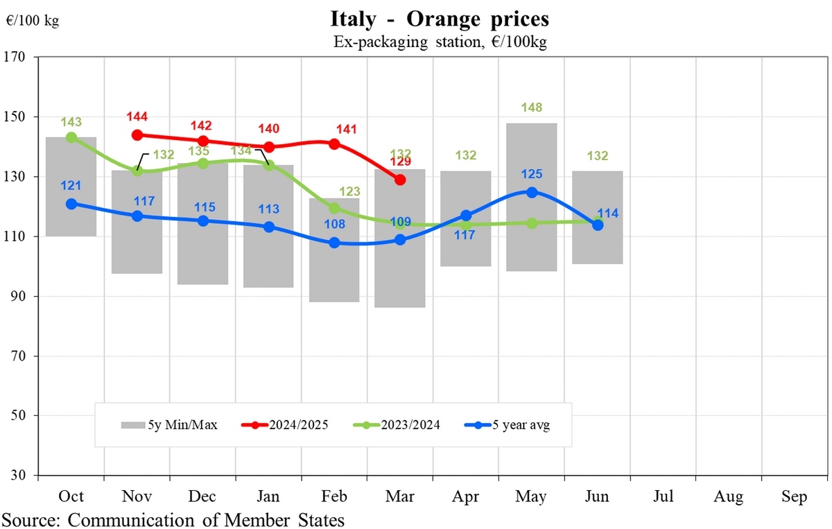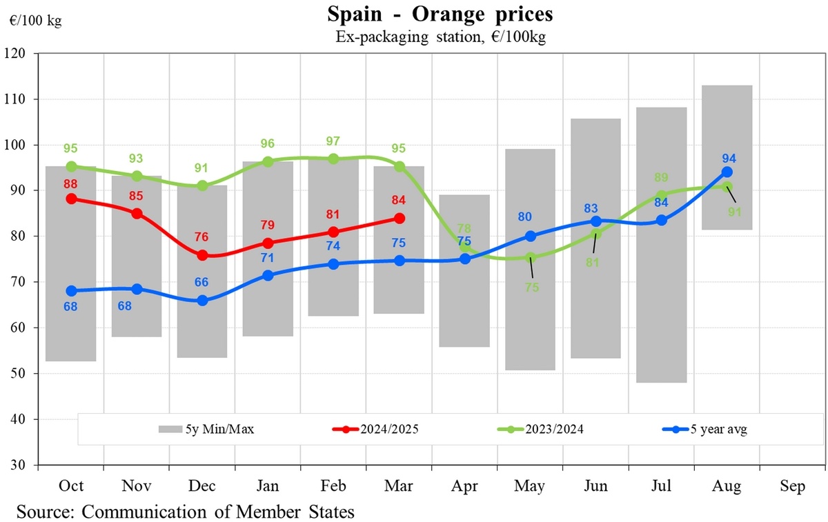 En Espagne, les prix des oranges ont connu une hausse constante de janvier à mars. Les prix sont passés de 79 €/100 kg en janvier à 81 € en février et 84 € en mars. Bien qu'ils soient inférieurs aux niveaux élevés de l'année dernière, les prix de 2025 restent supérieurs à la moyenne quinquennale et reflètent la vigueur modérée du marché. Les prix espagnols restent également dans la fourchette quinquennale, ce qui indique une relative stabilité des prix, soutenue par la demande intérieure et la demande d'exportation.
