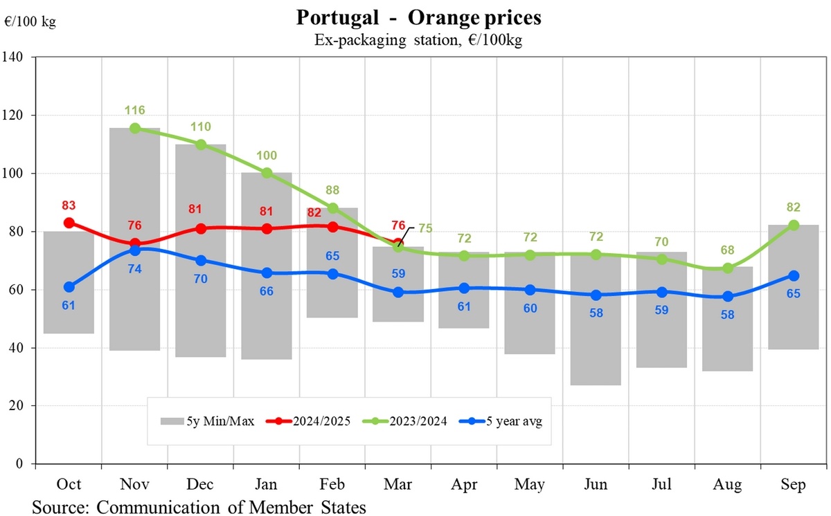 Les prix au Portugal sont restés stables mais inférieurs à ceux de l'Italie et de l'Espagne. En janvier, les prix étaient de 81 €/100 kg, augmentant légèrement à 82 € en février avant de chuter à 76 € en mars. Bien que ces prix soient supérieurs à la moyenne quinquennale, ils sont tombés en dessous des niveaux de 2023/2024 en mars. Les prix des oranges au Portugal semblent refléter un équilibre entre l'offre et la demande sans perturbations majeures, mais montrent des signes de fléchissement à mesure que la saison avance.
