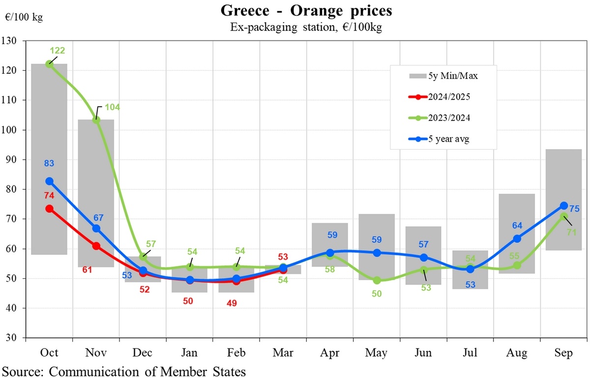 La Grèce, en revanche, a connu un premier trimestre difficile. En janvier, les prix n'étaient que de 50 €/100 kg et ont chuté à 49 € en février avant de remonter légèrement à 53 € en mars. Ces chiffres restent inférieurs à ceux de la saison précédente et à la moyenne quinquennale, ce qui indique une faiblesse persistante du marché. Le secteur grec des oranges subit la pression d'une demande limitée et peut-être d'une offre excédentaire, car les prix restent proches du minimum de la fourchette quinquennale.
