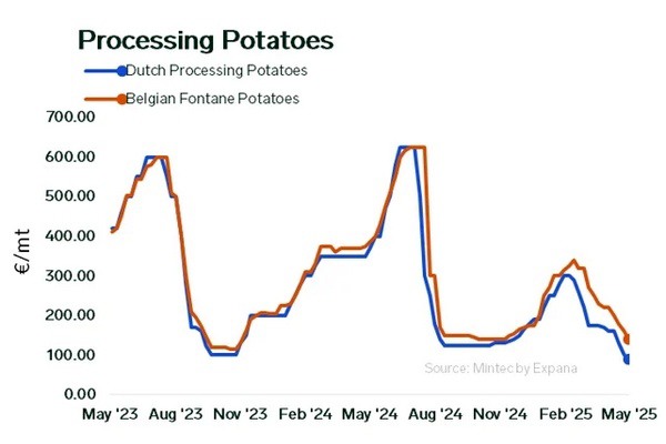Les attentes d'une récolte plus importante et plus précoce ont contribué à une baisse des prix de référence Expana (EBP) au cours du mois dernier, tant aux Pays-Bas qu'en Belgique. Le prix de référence pour les pommes de terre de transformation néerlandaises est actuellement de 140 €/tonne métrique (TM), soit une baisse de 36,4 % d'un mois sur l'autre et de 62,7 % d'une année sur l'autre. L'EBP pour les pommes de terre belges Fontane s'établit à 90 €/TM, en baisse de 47,1 % en glissement mensuel et de 74,3 % en glissement annuel, atteignant moins de 100 €/TM pour la première fois depuis mai 2021. Selon les acteurs du marché, les transformateurs sont largement couverts par des contrats pré-négociés, ce qui se traduit par une demande limitée de pommes de terre en vente libre dans l'ensemble de l'UE.