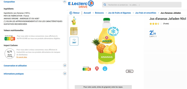 La mention Impact carbone présente sur le site Leclerc Drive pour le jus d'ananas Jafaden