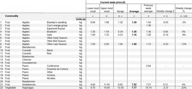 En revanche, le prix des fraises a connu une tendance à la hausse. Le prix moyen des fraises est passé de 7,21 £ par kilogramme la semaine précédente à 7,52 £ cette semaine, soit une augmentation de 0,31 £, ou 4%. Cette augmentation met en évidence un ajustement positif des prix sur le marché des fraises, contrastant avec la tendance à la baisse observée pour certaines variétés de pommes.